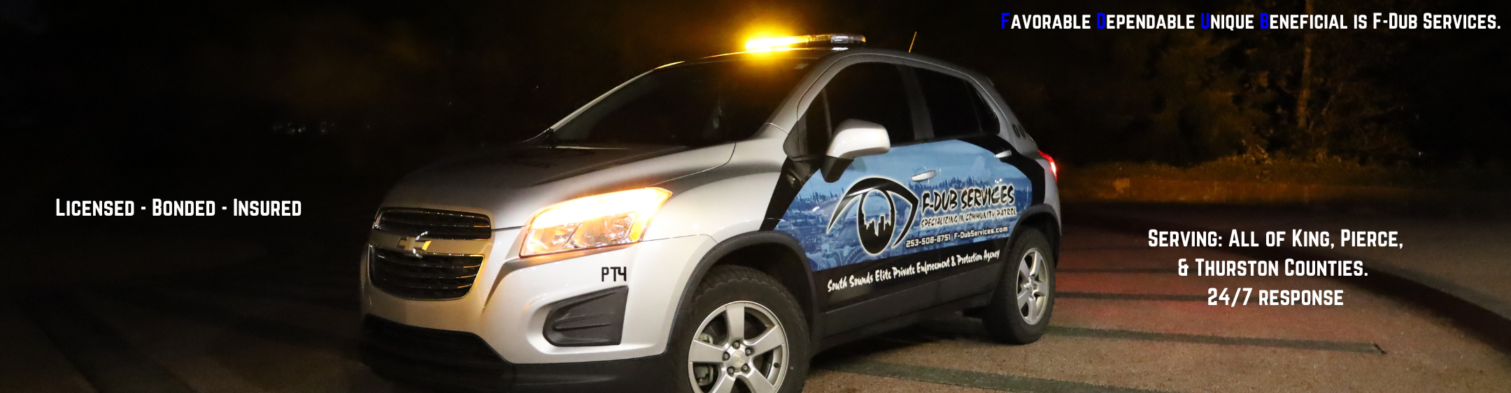 F-Dub Services is South Sounds Elite Private Enforcement and Protection Agency. F-Dub Specializes in Private Community and Security Patrol Services for all properties. F-Dub ensures property safety and desirability by focusing on Compliance, Corrective Action, Documentation, and Monitoring.